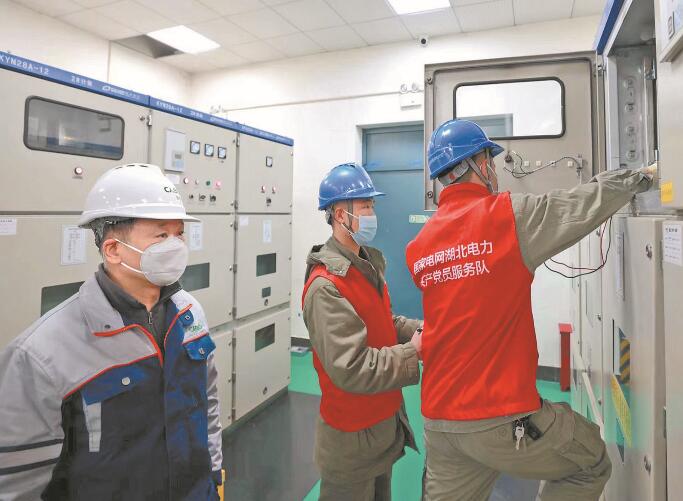 湖北鄂州供電公司黨員突擊隊隊員幫助企業(yè)測量低壓配電柜內(nèi)電壓。戴佩 攝