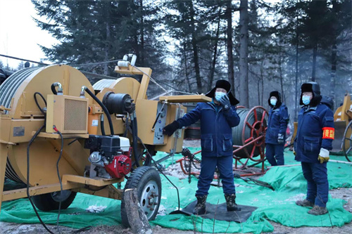 牽引機(jī)、電纜軸快速轉(zhuǎn)動,粗實(shí)的導(dǎo)線順著前方的鐵塔上的滑輪緩緩回收,導(dǎo)地線展放、張力緊線、附件安裝、導(dǎo)線壓接……冬季的寒風(fēng)刺骨,施工人員顧不上寒冷,加緊施工。