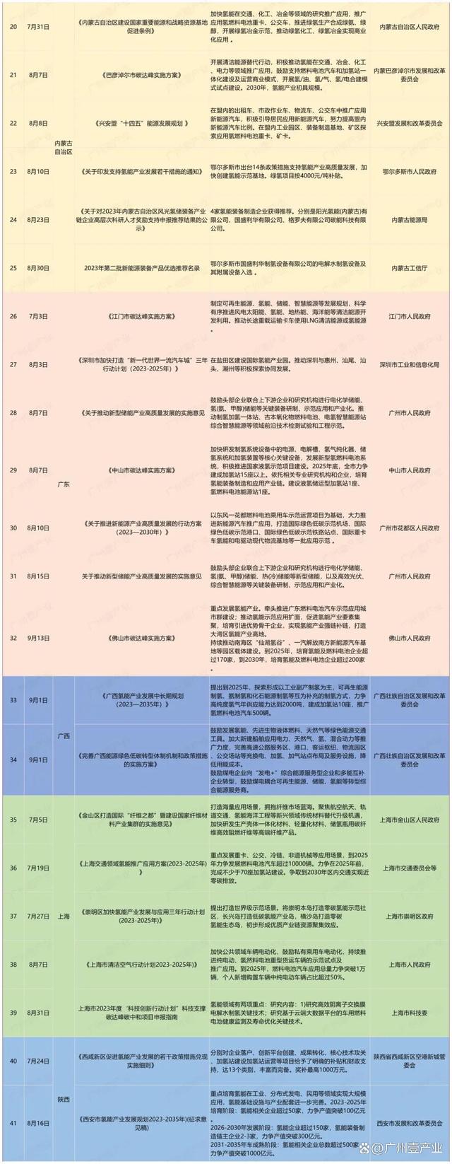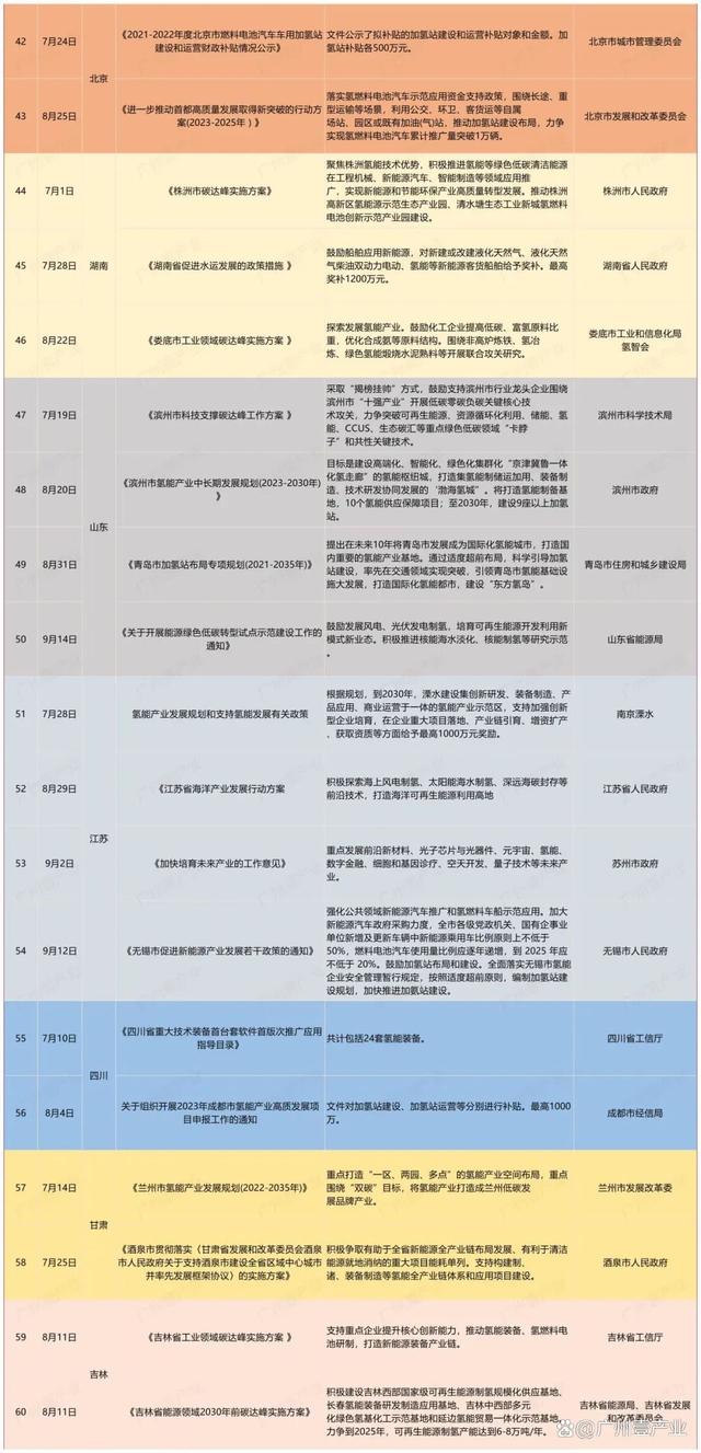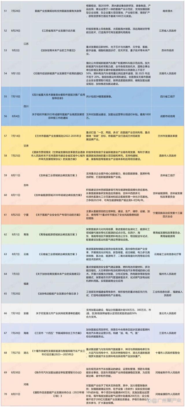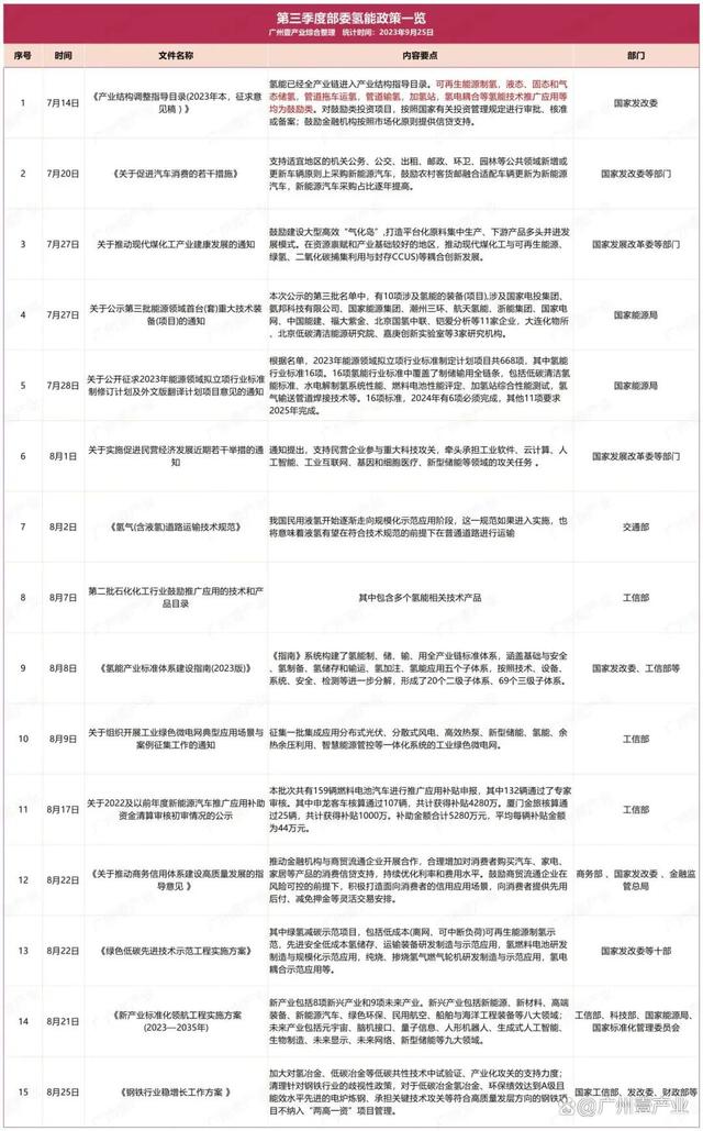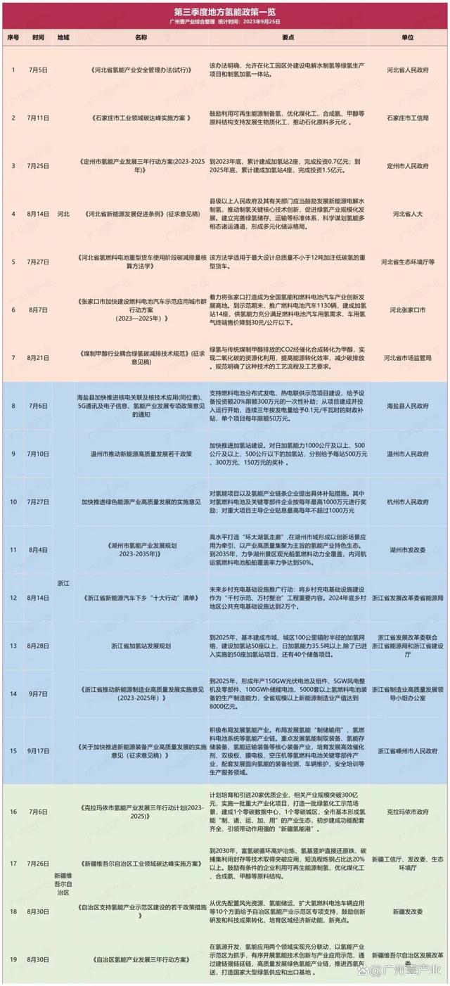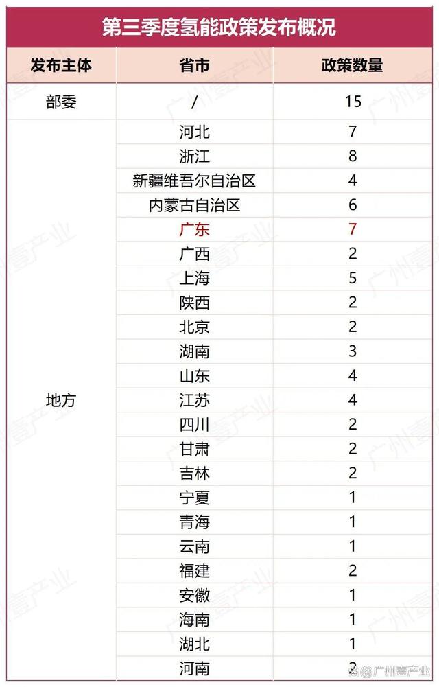 9月17日,浙江省嵊州市人民政府發(fā)布了《關(guān)于加快推進(jìn)新能源裝備產(chǎn)業(yè)高質(zhì)量發(fā)展的實(shí)施意見(征求意見稿)》。其中提到,積極布局發(fā)展氫能產(chǎn)業(yè)。布局發(fā)展氫能“制儲(chǔ)輸用”、氫燃料電池系統(tǒng)等氫能產(chǎn)業(yè)鏈。9月14日,山東省能源局發(fā)布了《關(guān)于開展能源綠色低碳轉(zhuǎn)型試點(diǎn)示范建設(shè)工作的通知》。文件中涉及到氫能的內(nèi)容有:鼓勵(lì)發(fā)展風(fēng)電、光伏發(fā)電制氫,培育可再生能源開發(fā)利用新模式新業(yè)態(tài);積極推進(jìn)核能海水淡化、核能制氫等研究示范等。9月13日,佛山市人民政府印發(fā)了《佛山市碳達(dá)峰實(shí)施方案》的通知。方案中提到,重點(diǎn)發(fā)展氫能產(chǎn)業(yè)。牽頭推進(jìn)廣東燃料電池汽車示范應(yīng)用城市群建設(shè),強(qiáng)化城市群內(nèi)各市資源共享、優(yōu)勢(shì)互補(bǔ)。加強(qiáng)氫能基礎(chǔ)設(shè)施建設(shè)。推動(dòng)氫能示范應(yīng)用擴(kuò)面,促進(jìn)氫能產(chǎn)業(yè)要素集聚,培育引進(jìn)優(yōu)勢(shì)骨干企業(yè),實(shí)現(xiàn)氫能產(chǎn)業(yè)強(qiáng)鏈補(bǔ)鏈,打造大灣區(qū)氫能產(chǎn)業(yè)高地。持續(xù)推動(dòng)南海區(qū)“仙湖氫谷”、一汽解放南方新能源汽車基地等園區(qū)載體建設(shè)。到2025年,培育氫能及燃料電池企業(yè)超過(guò)170家,到2030年,培育氫能及燃料電池企業(yè)超過(guò)200家。......據(jù)廣州壹產(chǎn)業(yè)不完全統(tǒng)計(jì),截至9月25日,今年第三季度(7、8、9月),部委共發(fā)布15條與氫能相關(guān)的政策,地方則有23個(gè)省(市)發(fā)布了70條氫能政策,合計(jì)85條。