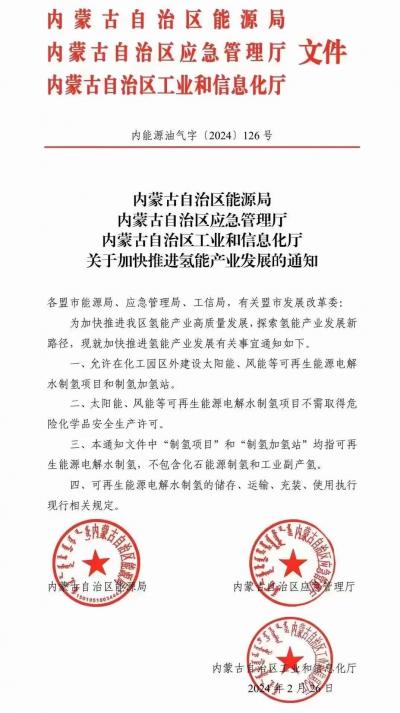 通知明確,允許在化工園區(qū)外建設太陽能、風能等可再生能源電解水制氫項目和制氫加氫站。太陽能、風能等可再生能源電解水制氫項目不需取得危險化學品安全生產許可??稍偕茉措娊馑茪涞膬Υ?、運輸、充裝、使用執(zhí)行現(xiàn)行相關規(guī)定。