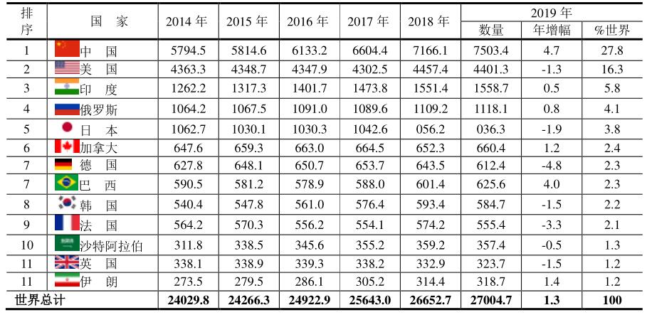2014~2019年主要國(guó)家的電力生產(chǎn)量(單位:TWh)
