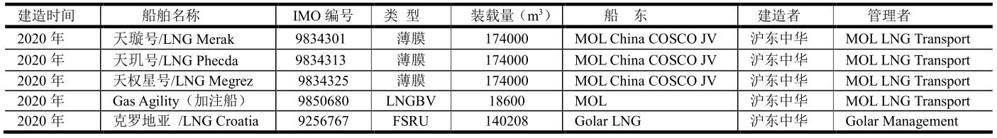2020年全球交付47艘船舶,包括6艘FSRU和11艘小于50000m3的船舶。交付船舶的平均容量(不包括FSRU和小于50000m3的船舶)為174765m3。2020年中國交付了四艘LNG運輸船舶。