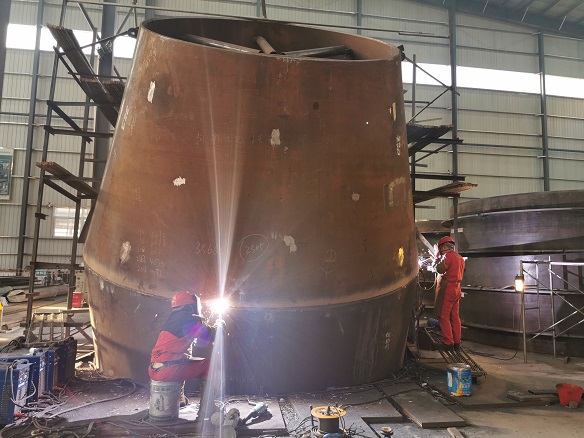 河南天池抽水蓄能電站鋼岔管為加強(qiáng)月牙肋型式,岔管主管直徑為4500mm,支管直徑為3100mm,分叉角為70度,擴(kuò)大率為115%。制造過(guò)程中岔管管殼全部為Q690E高強(qiáng)度鋼,月牙肋材質(zhì)為Q690EZ35。鋼岔管體積大,悶頭焊接過(guò)程為全封閉焊接,焊接技術(shù)要求高且難度大。