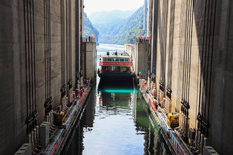 當(dāng)日,位于貴州省遵義市余慶縣境內(nèi)的烏江構(gòu)皮灘水電站通航工程開始試運行。構(gòu)皮灘水電站通航工程線路總長2306米,由上下游引航道、三級垂直升船機和兩級中間渠道組成。投入試運行后,500噸級船舶可從貴陽的開陽碼頭依次通過構(gòu)皮灘、思林、沙沱、彭水,在重慶涪陵進入長江。
