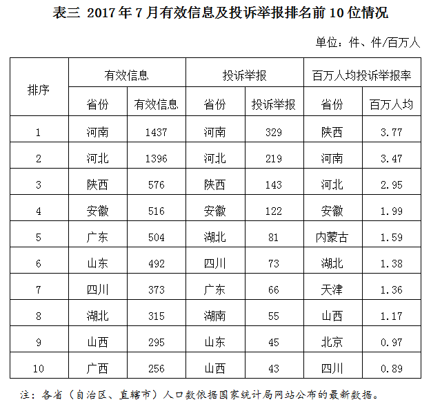 各?。ㄗ灾螀^(qū)、直轄市)按照收到的有效信息數(shù)量排序,河南、河北、陜西、安徽、廣東等省列全國(guó)前10位;按照投訴舉報(bào)數(shù)量排序,河南、河北、陜西、安徽、湖北等省排在全國(guó)前10位。按照百萬人均投訴舉報(bào)率排序,陜西、河南、河北、安徽、內(nèi)蒙古等省位于全國(guó)前10位。(2017年7月有效信息及投訴舉報(bào)排名前10位情況見表三)