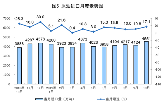 10月份,原油進(jìn)口4551萬噸,同比增長17.1%,增速比上月加快6.3個百分點。1—10月份,原油進(jìn)口41454.5萬噸,同比增長10.5%。