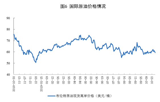 10月份,國際原油價格震蕩下跌,10月31日布倫特原油現(xiàn)貨離岸價格為59.3美元/桶,比9月30日下降1.69美元。