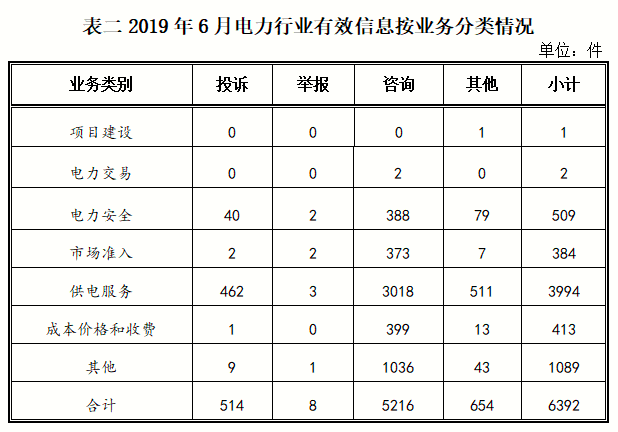電力行業(yè)排在首位,有效信息數(shù)量為6392件,占全部有效信息的80.33%;其中受理的投訴舉報(bào)數(shù)量為522件,占全部投訴舉報(bào)數(shù)量的93.38%。群眾反映的問(wèn)題主要集中在供電服務(wù)、電力安全、成本價(jià)格和收費(fèi)等方面。(2019年6月電力行業(yè)有效信息按業(yè)務(wù)分類(lèi)情況見(jiàn)表二)