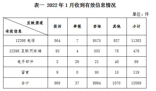 2022年1月,國家能源局12398能源監(jiān)管熱線(以下簡稱12398熱線)共收到有效信息12069件(包含投訴、舉報(bào)、咨詢和其他訴求類別),環(huán)比減少10.77%,同比減少6.45%。(2022年1月收到有效信息情況見表一)