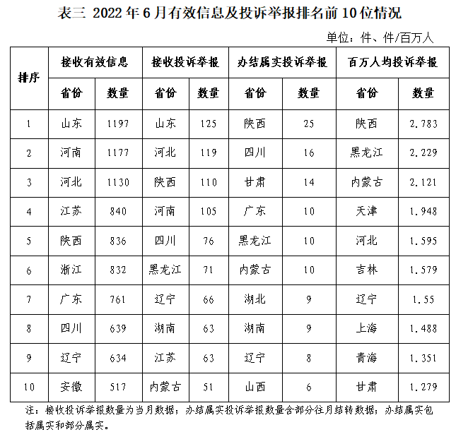 各省(自治區(qū)、直轄市)按照接收的有效信息數(shù)量排序,山東、河南、河北、江蘇、陜西、浙江、廣東、四川、遼寧、安徽排在全國(guó)前10位;按照接收的投訴舉報(bào)數(shù)量排序,山東、河北、陜西、河南、四川、黑龍江、遼寧、湖南、江蘇、內(nèi)蒙古排在全國(guó)前10位;按照辦結(jié)屬實(shí)的投訴舉報(bào)數(shù)量排序,陜西、四川、甘肅、廣東、黑龍江、內(nèi)蒙古、湖北、湖南、遼寧、山西排在全國(guó)前10位;按照百萬(wàn)人均投訴舉報(bào)數(shù)量排序,陜西、黑龍江、內(nèi)蒙古、天津、河北、吉林、遼寧、上海、青海、甘肅排在全國(guó)前10位。(2022年6月有效信息及投訴舉報(bào)排名前10位情況見(jiàn)表三)
