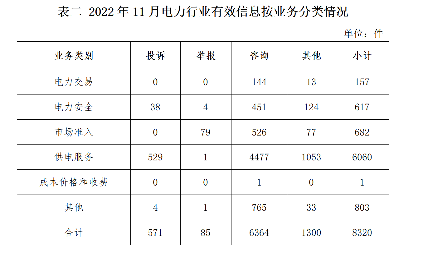 電力行業(yè)排在首位,有效信息數(shù)量為8320件,占全部有效信息的60.22%。群眾關(guān)注的內(nèi)容主要集中在供電服務(wù)、電力安全、市場準入等方面。(2022年11月電力行業(yè)有效信息按業(yè)務(wù)分類情況見表二)