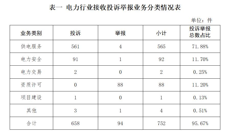 電力行業(yè)排在首位,數(shù)量為752件、占投訴舉報總數(shù)的95.67%,主要集中在供電服務(wù)、電力安全、資質(zhì)許可等方面。