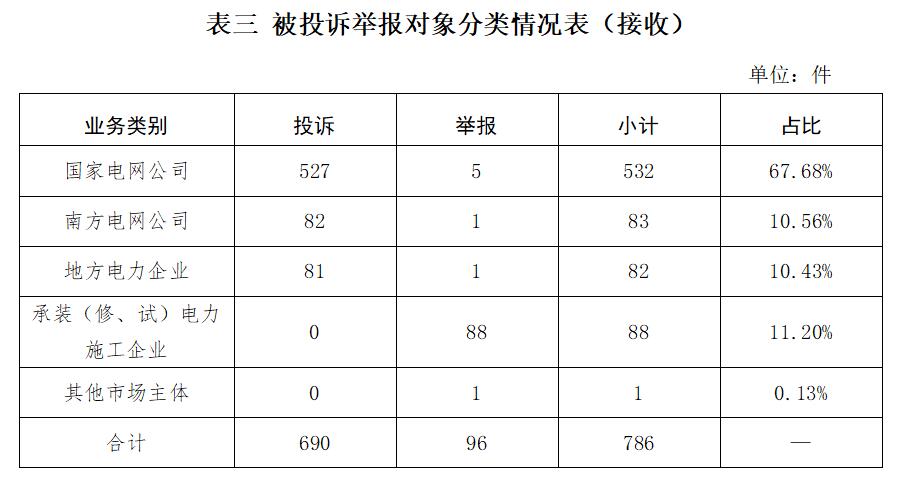 從被投訴舉報對象看,供電企業(yè)530件、占投訴舉報總數(shù)的83.07%,其中國家電網(wǎng)公司396件、占投訴舉報總數(shù)的62.07%,南方電網(wǎng)公司60件、占投訴舉報總數(shù)的9.40%,地方電力企業(yè)74件、占投訴舉報總數(shù)的11.60%;承裝(修、試)電力施工企業(yè)108件、占投訴舉報總數(shù)的16.93%。
