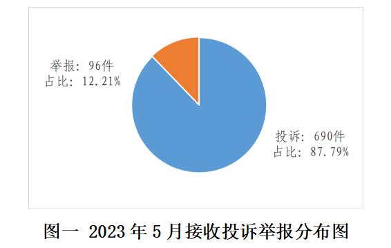 2023年5月,12398熱線共接收投訴舉報786件,環(huán)比增長22.62%、同比下降19.63%。其中:投訴690件,環(huán)比增長29.70%、同比下降22.47%;舉報96件,環(huán)比下降11.93%、同比增長9.09%。