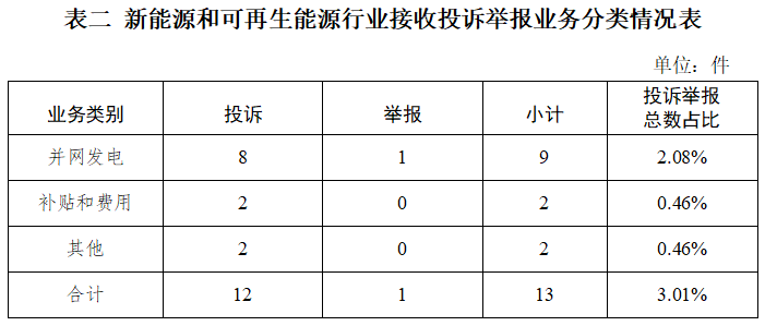 新能源和可再生能源行業(yè)排在第二位,數(shù)量為13件、占投訴舉報(bào)總數(shù)的3.01%,主要集中在并網(wǎng)發(fā)電、補(bǔ)貼和費(fèi)用等方面。