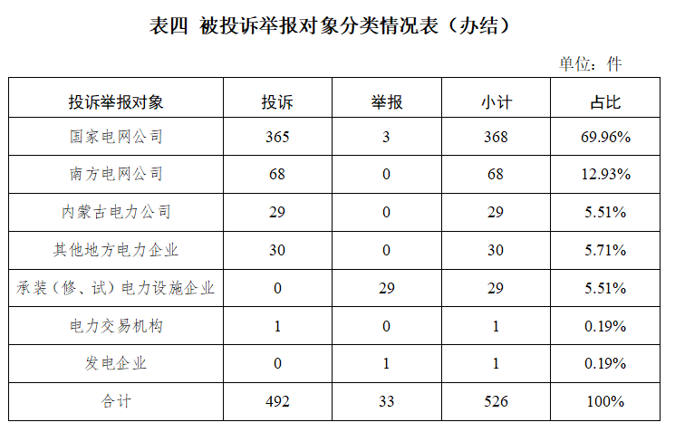 從被投訴舉報(bào)對(duì)象看,供電企業(yè)495件、占投訴舉報(bào)總數(shù)的94.10%,其中國(guó)家電網(wǎng)公司368件,占比69.96%;南方電網(wǎng)公司68件,占比12.93%;內(nèi)蒙古電力公司29件,占比5.51%;其他地方電力企業(yè)30件,占比5.71%;承裝(修、試)電力設(shè)施企業(yè)29件,占比5.51%;發(fā)電企業(yè)1件,占比0.19%;電力交易機(jī)構(gòu)1件,占比0.19%。