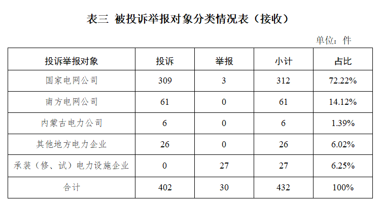 供電企業(yè)402件、占投訴舉報(bào)總數(shù)的93.75%,其中國(guó)家電網(wǎng)公司312件、占投訴舉報(bào)總數(shù)的72.22%,南方電網(wǎng)公司61件、占投訴舉報(bào)總數(shù)的14.12%,內(nèi)蒙古電力公司6件、占投訴舉報(bào)總數(shù)的1.39%,其他地方電力企業(yè)26件、占投訴舉報(bào)總數(shù)的6.02%;承裝(修、試)電力設(shè)施企業(yè)27件、占投訴舉報(bào)總數(shù)的6.25%。