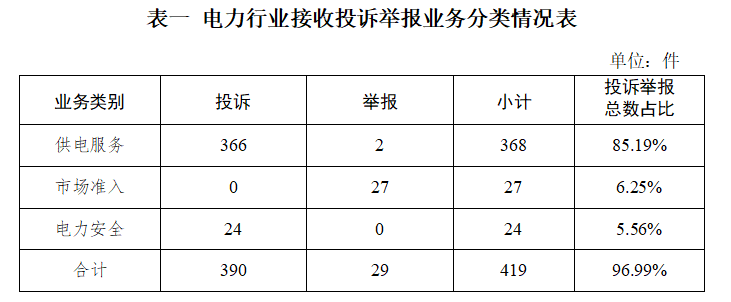 電力行業(yè)排在首位,數(shù)量為419件、占投訴舉報(bào)總數(shù)的96.99%,主要集中在供電服務(wù)、市場(chǎng)準(zhǔn)入、電力安全等方面。