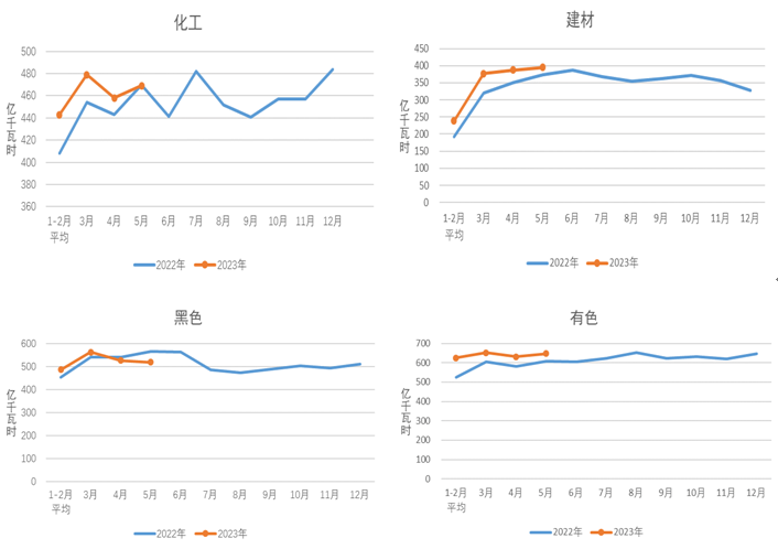 5月份,化工行業(yè)用電量469億千瓦時,同比增長0.5%;建材行業(yè)用電量395億千瓦時,同比增長5.7%;黑色金屬冶煉行業(yè)用電量518億千瓦時,同比下降8.2%;有色金屬冶煉行業(yè)用電量648億千瓦時,同比增長1.7%。