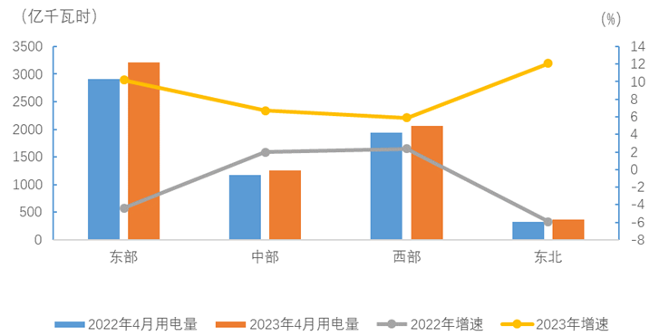4月份,東、中、西部和東北地區(qū)全社會用電量增速分別為10.2%、6.7%、5.9%和12.1%。
