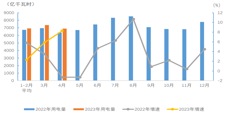 圖4 2022、2023年重點行業(yè)分月用電量情況