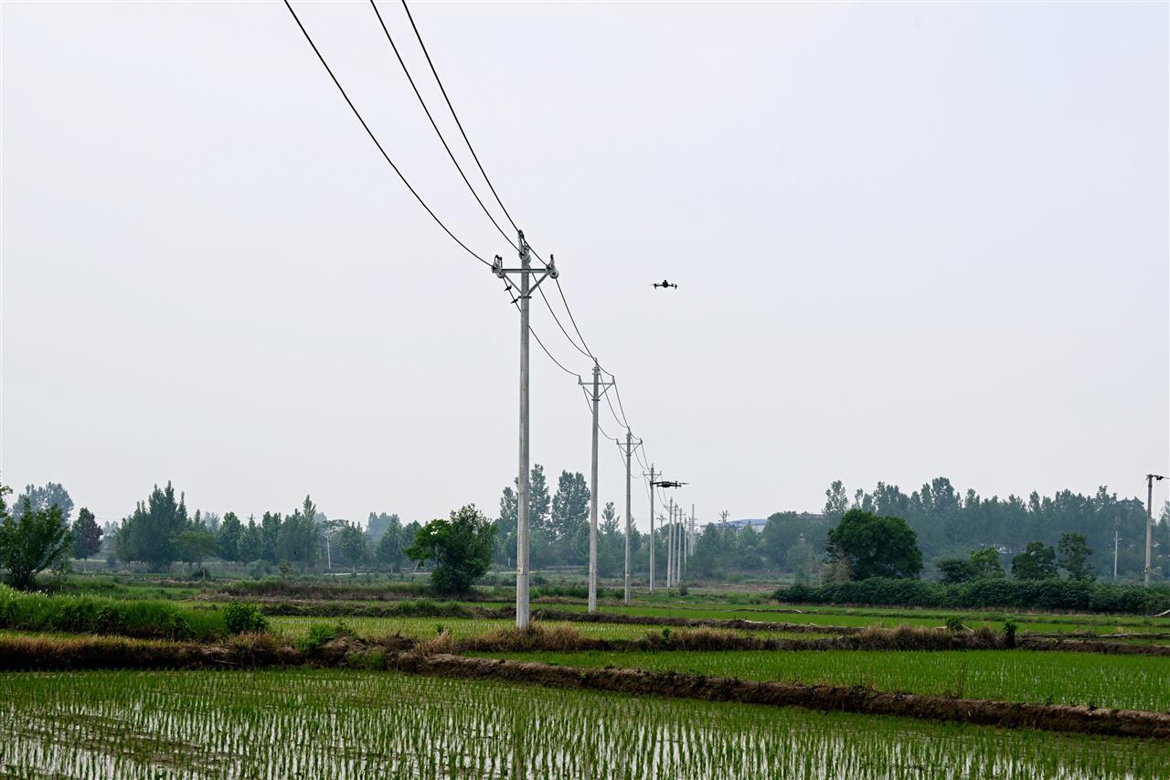 在湖北省安陸市木梓鎮(zhèn)10千伏江河線驗收現(xiàn)場,國網(wǎng)湖北電力利用無人機(jī)AI技術(shù)自主驗收配電架空線路(余健兵、何瑤 攝)