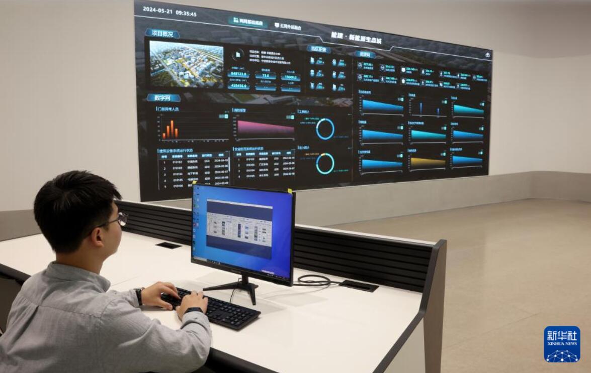 5月21日,技術(shù)人員在雄安新區(qū)雄安站樞紐片區(qū)的中國(guó)能建“能建·新能源生態(tài)城”項(xiàng)目展示區(qū)智慧運(yùn)營(yíng)中心工作。