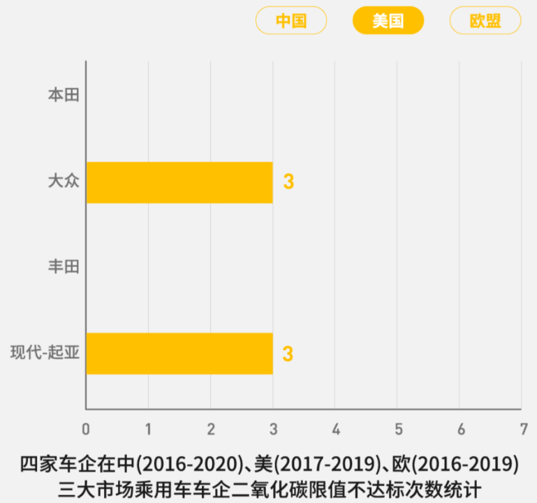 報(bào)告數(shù)據(jù)顯示,2016-2020年間,四家車企在中國(guó)均至少有兩次不達(dá)標(biāo),其中豐田五次不達(dá)標(biāo),本田與現(xiàn)代-起亞三次不達(dá)標(biāo),大眾則有兩次。