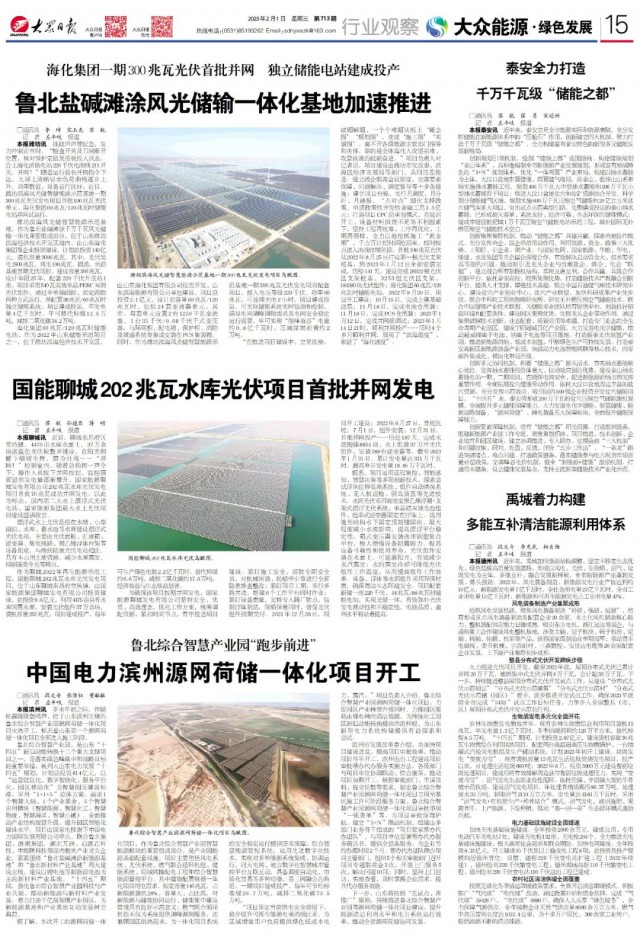 濰坊濱海風(fēng)光儲(chǔ)智慧能源示范基地,作為魯北鹽堿灘涂千萬千瓦風(fēng)光儲(chǔ)輸一體化重要組成部分,位于山東濰坊濱海經(jīng)濟(jì)技術(shù)開發(fā)區(qū)境內(nèi),由山東?;瘓F(tuán)等企業(yè)投資建設(shè),計(jì)劃總投資140億元,裝機(jī)容量3000兆瓦。其中,光伏發(fā)電2900兆瓦,風(fēng)電100兆瓦。據(jù)悉,示范基地首期光伏項(xiàng)目,建設(shè)容量300兆瓦,設(shè)計(jì)年限25年,配套220千伏升壓站1座。項(xiàng)目采用540瓦高效單晶PERC雙面光伏組件,通過平單軸跟蹤、固定跟蹤兩種方式運(yùn)行,并配置30兆瓦/60兆瓦時(shí)獨(dú)立儲(chǔ)能系統(tǒng)。項(xiàng)目建成投運(yùn),年發(fā)電量4億千瓦時(shí),年可替代標(biāo)煤12.5萬噸,減排二氧化碳34.2萬噸。