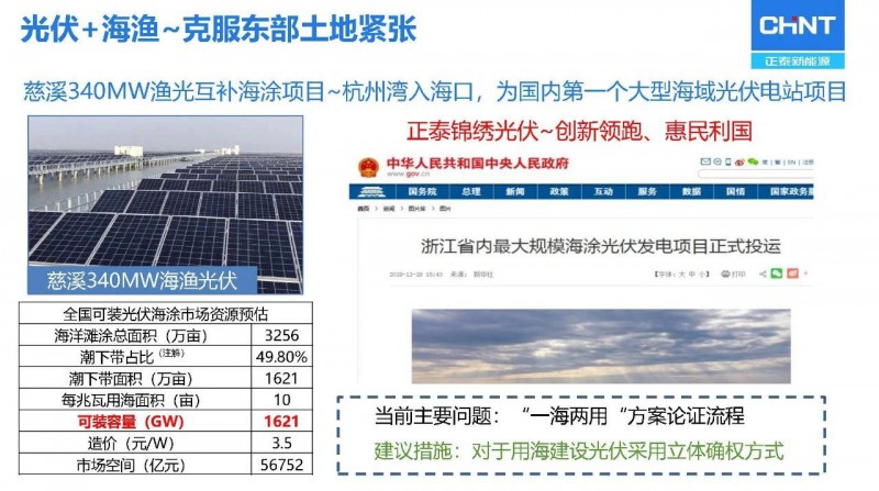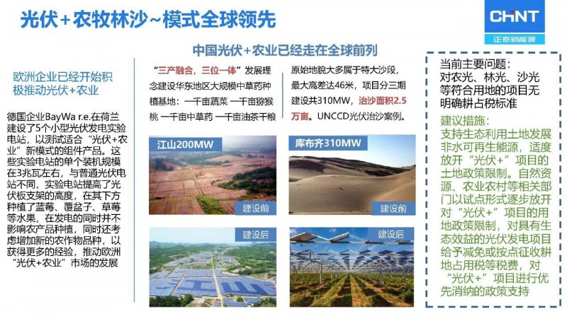 2021年2月3日,由中國光伏行業(yè)協(xié)會主辦的“光伏行業(yè)2020年發(fā)展回顧與2021年形勢展望網(wǎng)絡(luò)研討會”上,浙江正泰新能源開發(fā)有限公司總裁陸川針對我國目前光伏+融合發(fā)展模式趨勢進行了分析。我國已經(jīng)走在了全球光伏+農(nóng)業(yè)行業(yè)的前列,針對農(nóng)光互補電站,他希望能夠推動自上而下的關(guān)于農(nóng)光互補設(shè)施正常補償機制的兌現(xiàn)以促進行業(yè)更優(yōu)發(fā)展。光伏+海漁的合作方式適用于我國東南海岸,克服了東部土地緊張,不但能夠產(chǎn)生發(fā)電效益,同時還能產(chǎn)生漁業(yè)收益。光伏+儲能、光伏+風電、光伏+制氫等均為我國光伏應(yīng)用新模式做出突出貢獻。戶用光伏的智能化應(yīng)用、光伏+信號基站的互補應(yīng)用、光伏+交通實現(xiàn)綠電出行等跨界創(chuàng)新的光伏應(yīng)用模式也將逐漸推廣,實現(xiàn)全社會層面的綠電應(yīng)用。