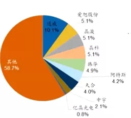 就中游的行業(yè)格局來看,2019年光伏電池產(chǎn)量全球市占率前五的分別為通威,愛旭股份,晶澳,晶科和華韓。其中通威是連續(xù)三年成為全球產(chǎn)能及出貨量第一的獨(dú)立第三方電池企業(yè)。但其CR5市占率不足30%,競(jìng)爭(zhēng)較為激烈。