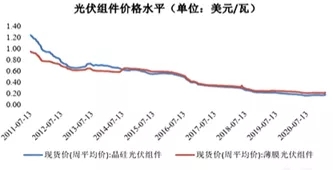 從光伏發(fā)電的成本看,光伏組件和配件價(jià)格都在逐漸下降。2008年,我國光伏組件平均成本為25元,2019年這一成本降至了2元。