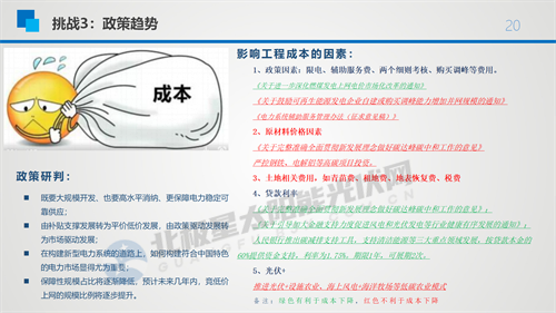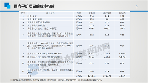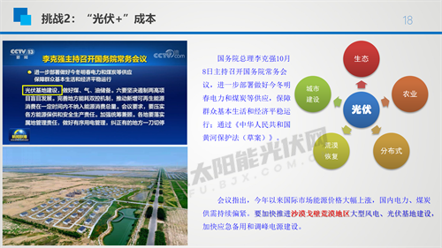 與往年不同的是,雖然我們?cè)?ldquo;十三五”期間也有系統(tǒng)成本和非系統(tǒng)成本的因素,但是今年光伏系統(tǒng)成本有逐漸上升的趨勢(shì),如更高電壓等級(jí)的配電站建設(shè)費(fèi)用、跨省特高壓輸送中省內(nèi)發(fā)電設(shè)施建設(shè)費(fèi)用、配置儲(chǔ)能設(shè)施費(fèi)用等建設(shè)成本在不斷增加。更重要的是光伏組件的價(jià)格和安裝成本,目前組件成本占到系統(tǒng)成本的50%左右,所以組件價(jià)格還是決定這個(gè)項(xiàng)目生死非常關(guān)鍵的因素。
