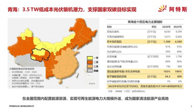 青海具有大規(guī)模發(fā)展光伏獨(dú)特的資源和區(qū)位優(yōu)勢(shì),首先土地資源豐富,同時(shí)陽光燦爛,年日照時(shí)數(shù)3100~3600小時(shí),年輻射量7,000~8,000 MJ/m2,位居全國(guó)第二位,僅低于西藏,相同光伏裝機(jī)容量,發(fā)電量較相鄰的甘肅和新疆高出15%~25%;青海接近中國(guó)地理中心,便于電力外送;全省光伏裝機(jī)資源潛力3.5TW,是目前全國(guó)光伏裝機(jī)總?cè)萘康氖抖啵夥l(fā)電前景廣闊,是我國(guó)實(shí)現(xiàn)雙碳目標(biāo)重要的資源支撐。