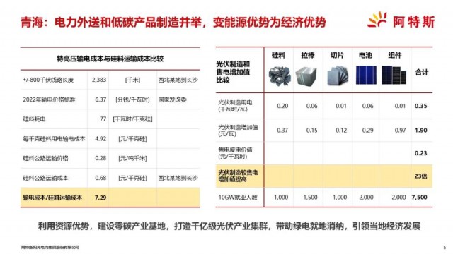 以前,在建設(shè)燃煤電站時(shí),要做的經(jīng)濟(jì)分析是對(duì)比運(yùn)煤和輸電成本。而我們今天在青海要做的是輸電和把電力就地轉(zhuǎn)化成產(chǎn)品的成本對(duì)比分析。在青海建設(shè)附加值高、技術(shù)和用能密集的多晶硅料,然后把部分多晶硅料就地加工成碳足跡低的綠色光伏組件產(chǎn)品,另一部分硅料運(yùn)輸?shù)侥茉炊倘笔》菔褂?。?jù)國(guó)家發(fā)改委新近發(fā)布的三條特高壓線路的輸電價(jià)格,我們測(cè)算硅料運(yùn)輸?shù)某杀静患拜旊姵杀镜?/7。