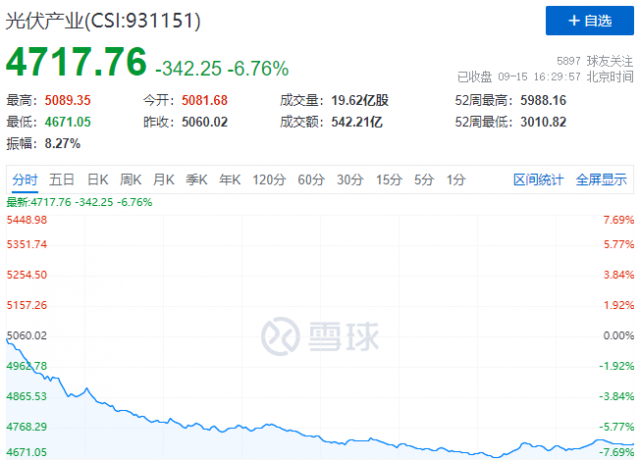 9月15日,受歐盟委員會擬推行“涉J法案”等利空消息影響,光伏板塊全線暴跌,中證光伏產業(yè)指數(shù)(CSI:931151)報收4718點,跌幅達到6.67%,自8月18日高點以來,累計跌幅達到18.6%。