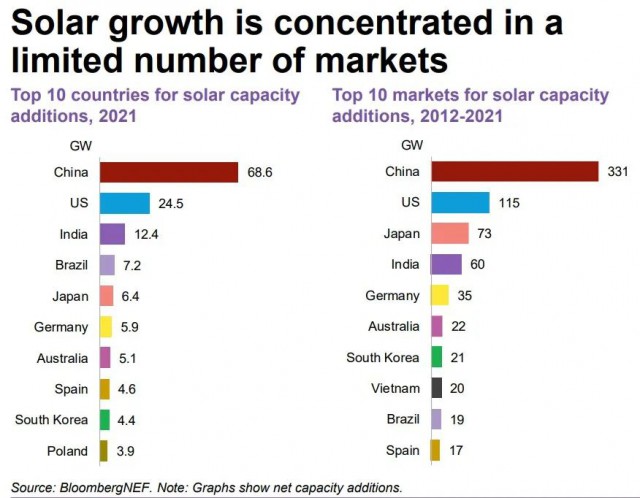 根據(jù)BNEF的數(shù)據(jù),市場領(lǐng)導(dǎo)者中國2021年開發(fā)了68.6GW太陽能,其次是美國的24.5GW和印度的12.4GW。