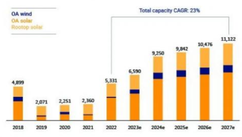 印度的基本關(guān)稅(BCD)進口稅以及型號和制造商批準名單(ALMM)計劃在繼續(xù)限制供應(yīng),因此,印度最近一直在經(jīng)歷組件供應(yīng)短缺問題。鑒于此,報告認為,在今年剩下的時間里,增速將會放緩,但2024年及之后的數(shù)字將開始更快的增長。預(yù)計2023年,企業(yè)可再生能源容量將增加6.5GW,而2024年將超過9GW。