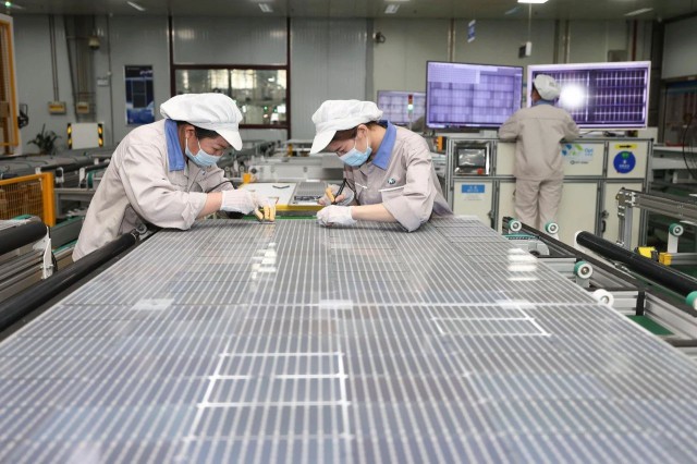 ▲江蘇省連云港市,工人們正在生產(chǎn)用于出口的太陽(yáng)能光伏板。圖片來(lái)源:Cynthia Lee / Alamy