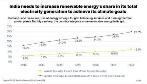 該報告聲稱,在2016年至2022年期間,印度安裝的可再生能源發(fā)電設施裝機容量在其印度總能源結構中的份額僅增長了6.5%。但同期可再生能源發(fā)電量的份額增長了13.6%。印度正在迅速開發(fā)可再生能源,其速度快于化石燃料發(fā)電設施,但需要開發(fā)更多的可再生能源以實現其氣候目標。
