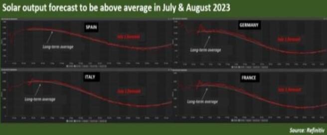 Refinitiv(路孚特,倫敦證券交易所集團旗下企業(yè),是全球最大的金融市場數(shù)據(jù)和基礎(chǔ)設(shè)施提供商之一)對國家級太陽能產(chǎn)量的預(yù)測顯示,西班牙、德國、法國和意大利的產(chǎn)量將遠(yuǎn)高于長期平均水平——所有主要太陽能生產(chǎn)國最近幾周都經(jīng)歷了持續(xù)炎熱的天氣。