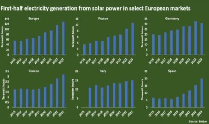 據(jù) Ember(Ember是一個獨立能源智庫,旨在通過數(shù)據(jù)和分析,推動世界向清潔電力轉(zhuǎn)型。) 稱,今年上半年歐洲太陽能發(fā)電量較 2022年同期,增長了近 11%,達(dá)到創(chuàng)紀(jì)錄的 129.2 太瓦時。