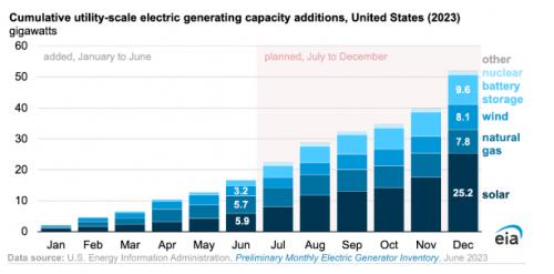 天然氣發(fā)電占2023年上半年美國(guó)新增產(chǎn)能的34%(5.7吉瓦),僅次于太陽(yáng)能。2023年上半年并網(wǎng)的兩個(gè)最大項(xiàng)目是天然氣發(fā)電廠:俄亥俄州的1836兆瓦Guernsey發(fā)電站和伊利諾伊州的1214兆瓦CPV Three Rivers能源中心。