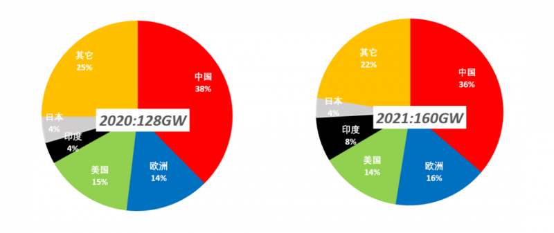 2021年光伏裝機(jī)量的增長主要來源于幾大傳統(tǒng)太陽能市場(chǎng):中國/美國/歐洲/印度