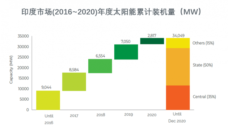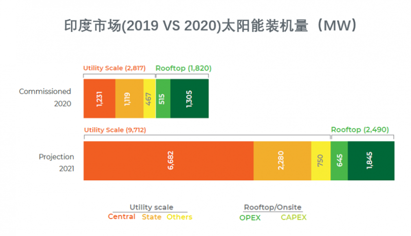 2020年,印度新增了約2.8 GW的公用事業(yè)規(guī)模太陽能裝機(jī)容量和1.8 GW的屋頂太陽能容量,較2019年下降了65%