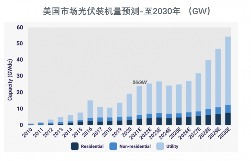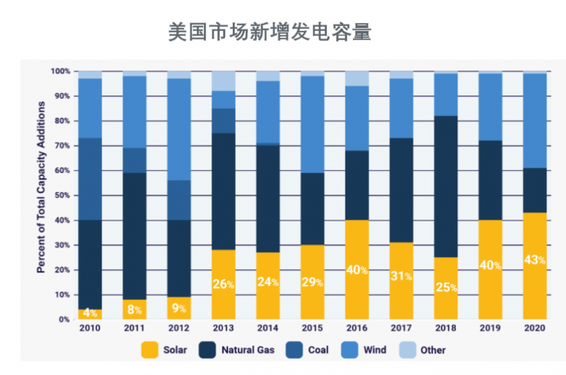 2020年,美國太陽能新增裝機(jī)較2019年增長了43%,裝機(jī)量達(dá)到了19.2GW,突破了歷史記錄