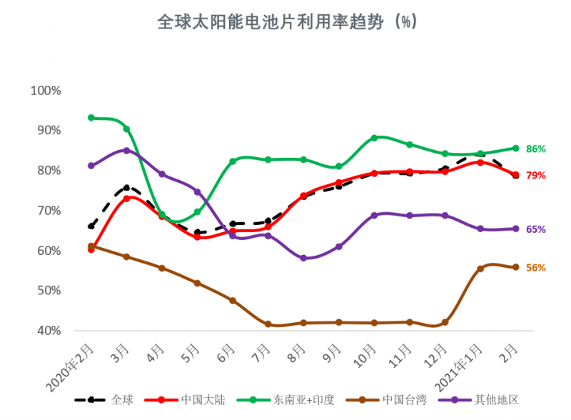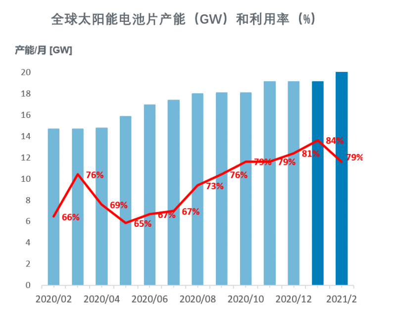 2021年2月,由于中國市場(chǎng)經(jīng)歷了春節(jié)假期,全球及中國大陸地區(qū)電池片產(chǎn)能利用率下降至79%