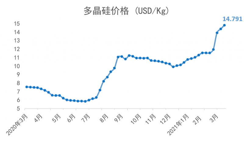 從2021年年初開始,多晶硅短缺的狀況持續(xù)加劇。2021年3月,歷經(jīng)了傳統(tǒng)的春節(jié)假期之后,上游多晶硅環(huán)節(jié)更加供不應(yīng)求,目前的價(jià)格相比于2021年1月6日的價(jià)格已上漲了41%;同時(shí),由于上游多晶用料呈現(xiàn)價(jià)格上漲,硅片端的價(jià)格同時(shí)跳漲。