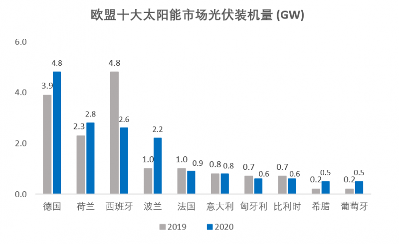 德國依然是歐洲最大的太陽能裝機(jī)市場(chǎng),2020年的光伏裝機(jī)量達(dá)到了4.8GW,而西班牙的光伏裝機(jī)量則由于新冠疫情下的封城影響呈現(xiàn)了大幅下降狀態(tài)