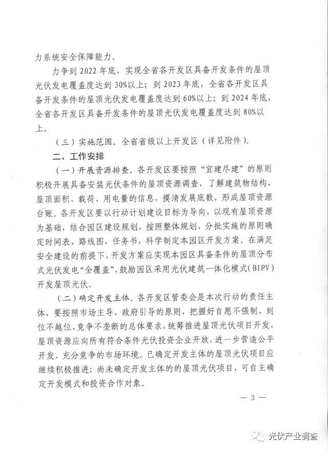 力爭(zhēng)到2022年底,實(shí)現(xiàn)全省各開(kāi)發(fā)區(qū)具備開(kāi)發(fā)條件的屋頂光伏發(fā)電覆蓋度達(dá)到30%以上;到2023年底,全省各開(kāi)發(fā)區(qū)具備開(kāi)發(fā)條件的屋頂光伏發(fā)電覆蓋度達(dá)到60%以上;到2024年底,全省各開(kāi)發(fā)區(qū)具備開(kāi)發(fā)條件的屋頂光伏發(fā)電覆蓋度達(dá)到80%以上。